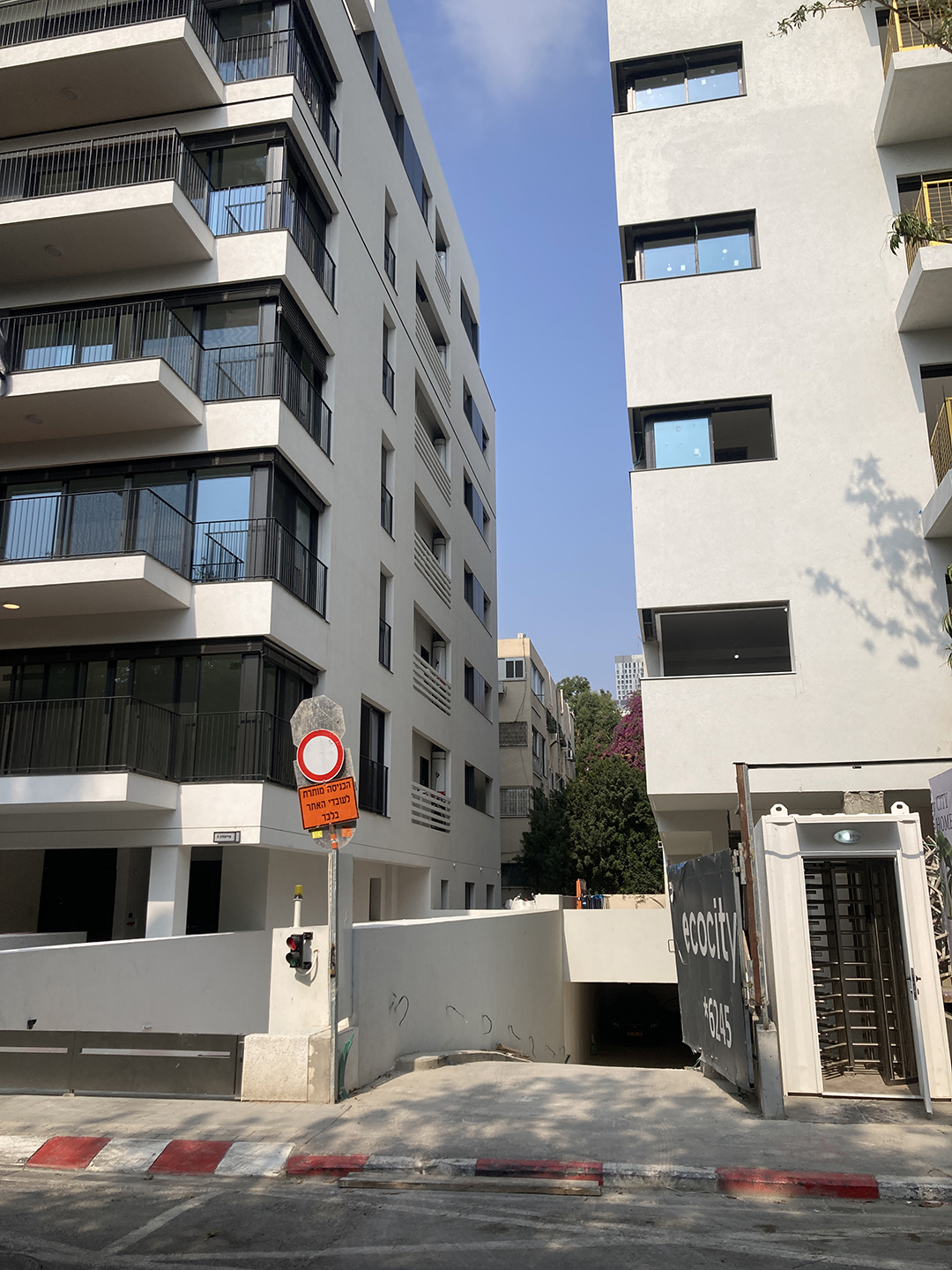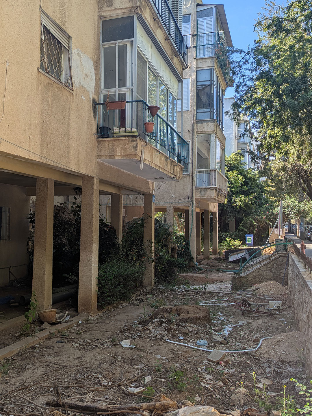 במקביל, המרווחים שבין הבניינים משנים את פניהם. חללים שבעבר תפקדו כמרחב ירוק משותף ומבודד הופכים למרחבים טכניים – ירידה לחניון, מעברי שירות, גדרות, קירות תומכים ואדניות מוגבהות. במקום מעטפת ירוקה ורציפה מתהווה כעת חוויית מגורים עירונית חשופה, המשפיעה לרעה על הטמפרטורה, על האקוסטיקה ועל תחושת הפרטיות.