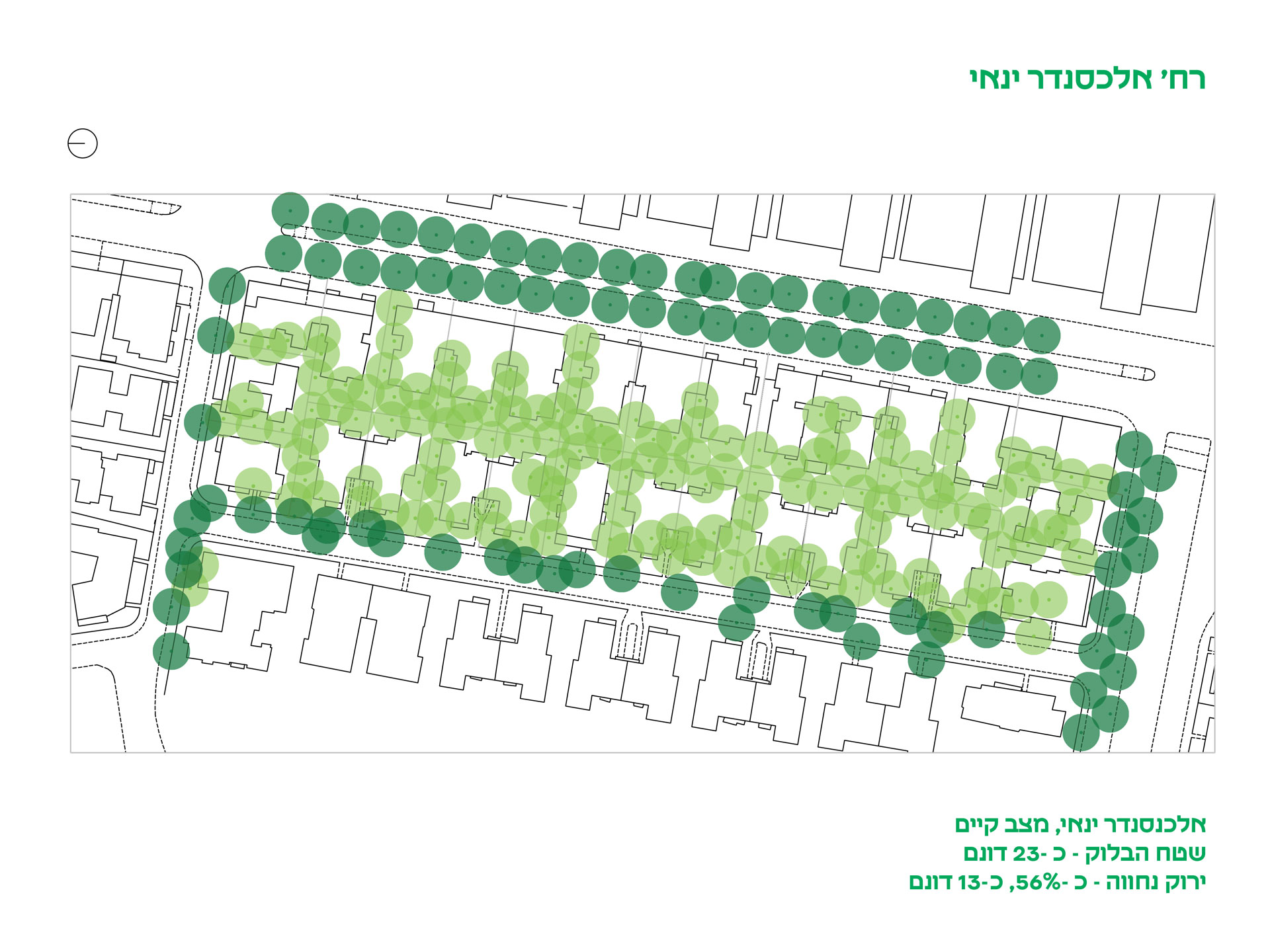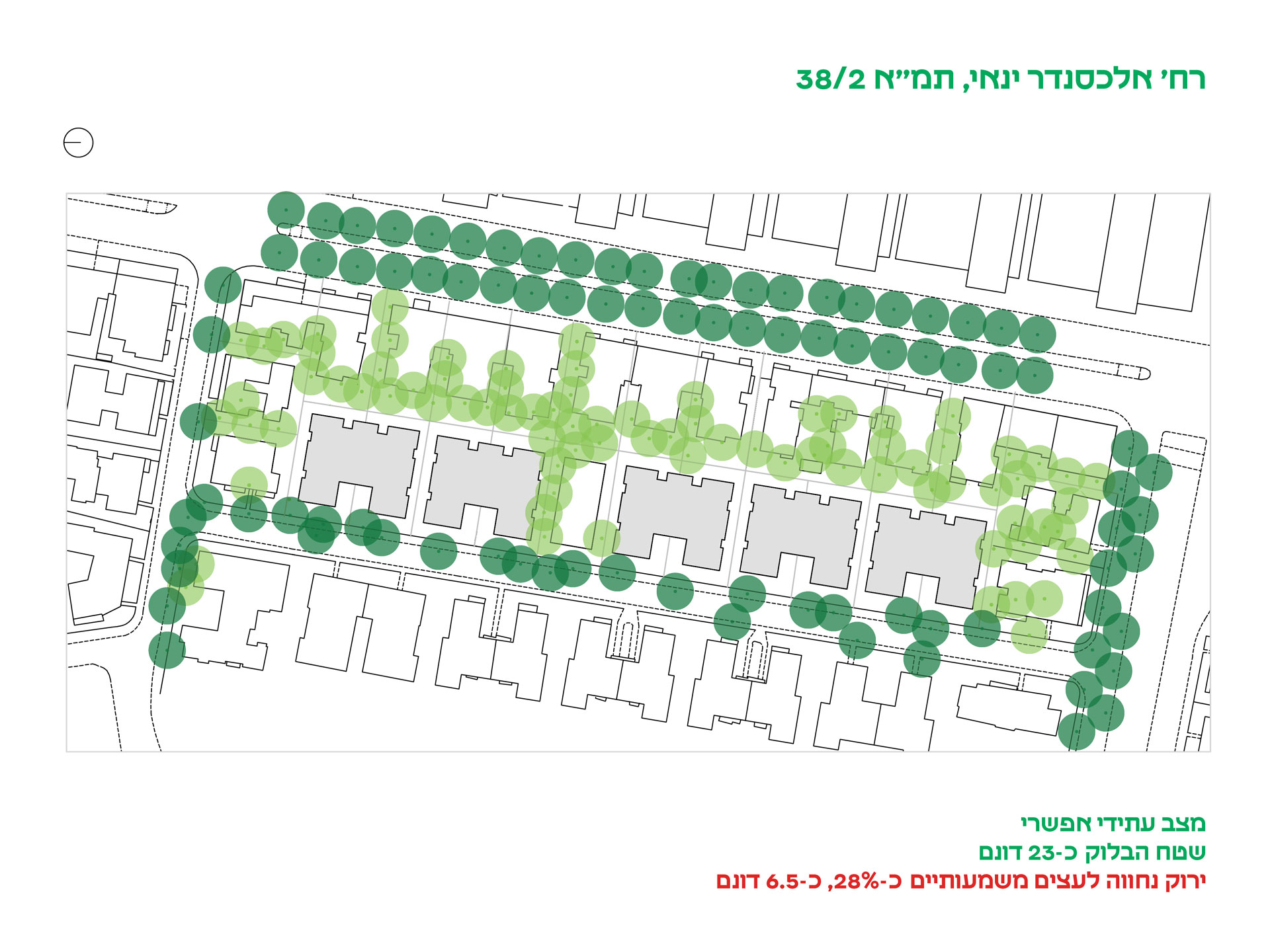 כאשר מגרש עובר תמ״א 38/2, האתר כולו נחפר. הדבר מביא לעקירת עצי פיקוס, המצויים ב־35% מהמגרשים ומספקים את רוב הצל הפונקציונלי. ייעקרו גם עצי פרי כהדרים ורימונים ב־25% אחוזים מהמגרשים, ענקי צל כצאלון וסיגלון ב־10%, ועצי עוגן אנכיים כברוש ואראוקריה ב־10%. דקלים, שיחים וקקטוסים, אף שהם דומיננטיים מספרית, מספקים ערך צל זניח ונתפסים כמינים שניתנים להחלפה בקלות.