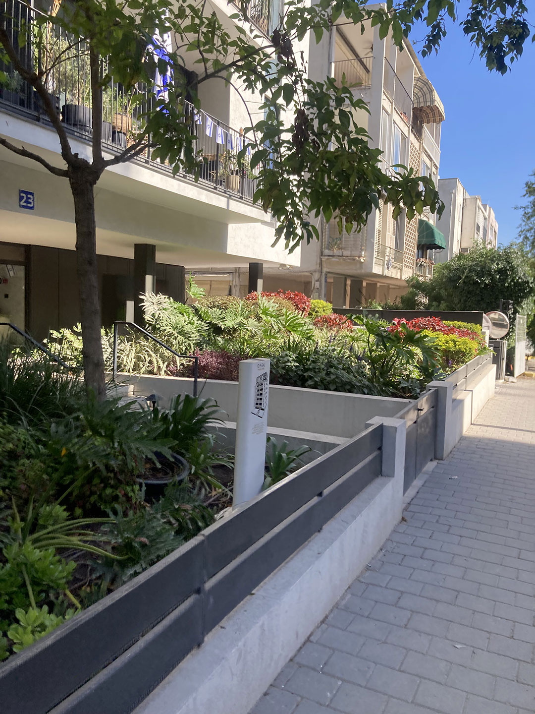 What meets the sidewalk instead are raised concrete planters, producing what might be described as “bonsai frontages”: controlled, decorative greenery devoid of large trees capable of supporting walkability, well-being, or even fruit-bearing within the city.